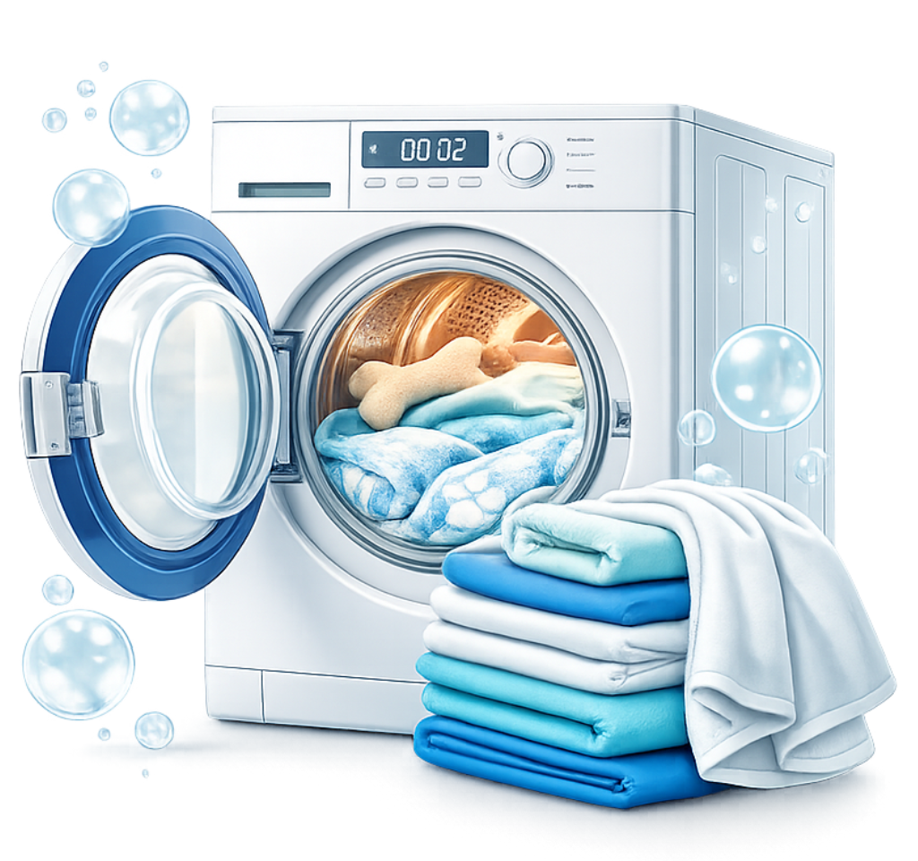 Cuidado especial para roupas, mantas e acessórios do seu pet, com máquina dedicada.